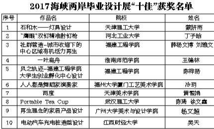 上周五,“2017海峡两岸高校毕业设计展颁奖仪式”在华侨大学举行,经过多轮公开展示、评选及最终答辩,从3296件海峡两岸高校毕业设计作品中诞生20强作品,分获“十佳”作品及优秀作品。“这是我市工业设计产业领域的又一盛事。 ”泉州市经信委党委专职副书记曾钟远表示,将有效服务、助力泉州产业从制造向质造、智造升级发展。□本报记者 王宇静 通讯员 孙雪松 文/图