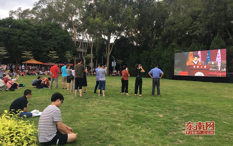 许多学生家长在校园的草坪上从LED屏观看毕业典礼。