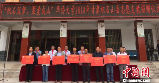 8月6日,华侨大学2018年积石山县志愿支教捐赠仪式举行,华侨大学副校长吴季怀等一行人向该县捐赠爱心款物34.5万元,其中包括“一帮一”圆梦助学金9万余元、泉州市企业爱心书包600个、甘肃晋江商会捐赠的价值4万元体育教具。