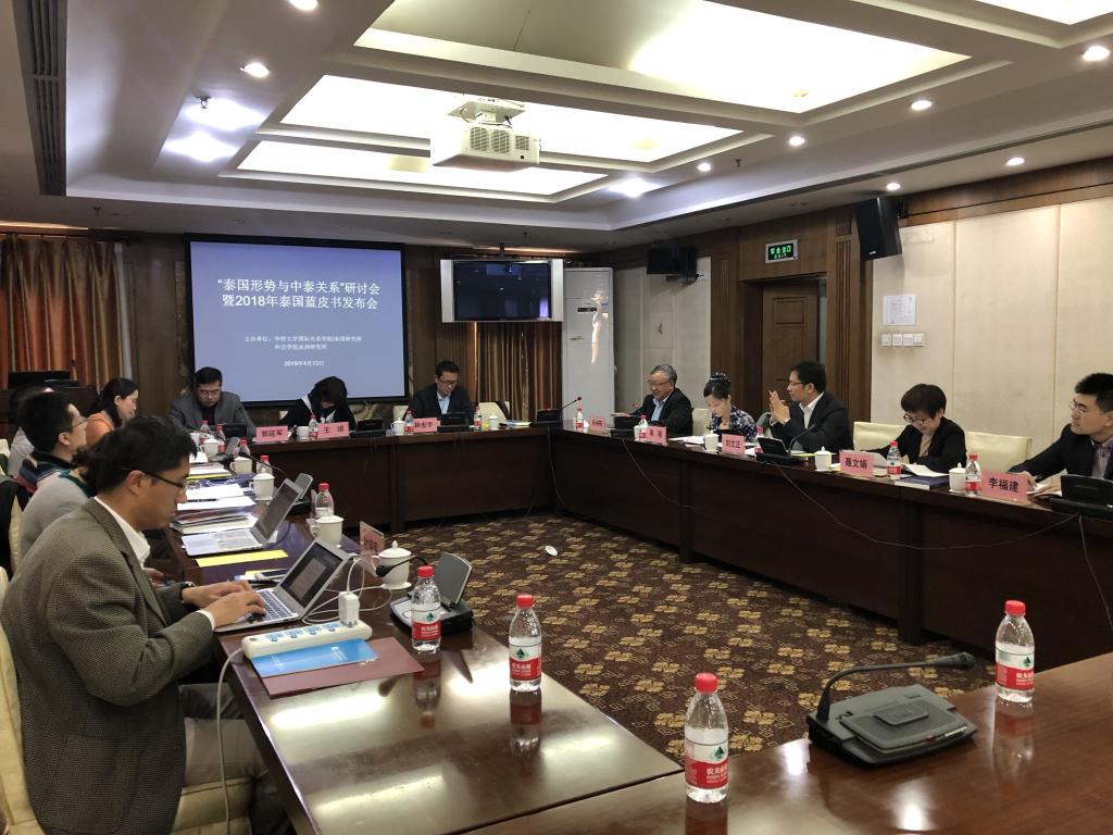 2019年4月13日上午,由华侨大学国际关系学院/泰国研究所、外交学院亚洲研究所联合主办的“‘泰国形势与中泰关系’研讨会暨2018年泰国蓝皮书发布会”在北京举行。来自华侨大学、外交学院、北京大学、泰国法政大学、中国社会科学院、中国现代国际关系研究院、国防大学、国际关系学院、社科文献出版社等高校和研究机构的10余位专家学者与会。外交学院亚洲研究所所长郭延军主持会议。