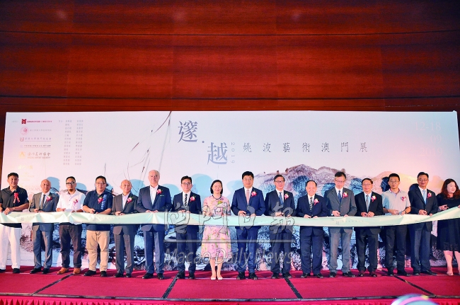嘉宾为“邃 · 越二〇一九姚波艺术澳门展”主持开幕剪彩