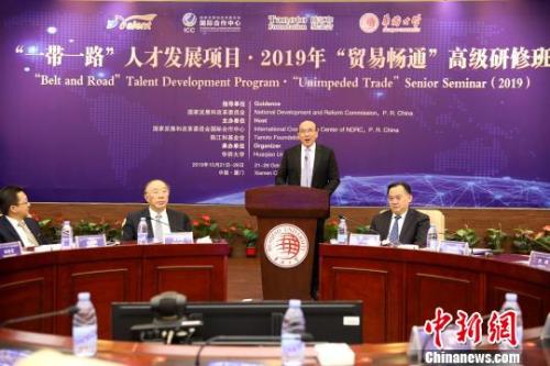 中新网厦门10月22日电 (黄咏绸)“一带一路”人才发展项目2019年“贸易畅通”高级研修班22日在华侨大学厦门校区开班,吸引了来自印尼、马来西亚、新加坡、越南、菲律宾等12个国家的36名高级别政府官员、商界精英和专家学者共同参与。