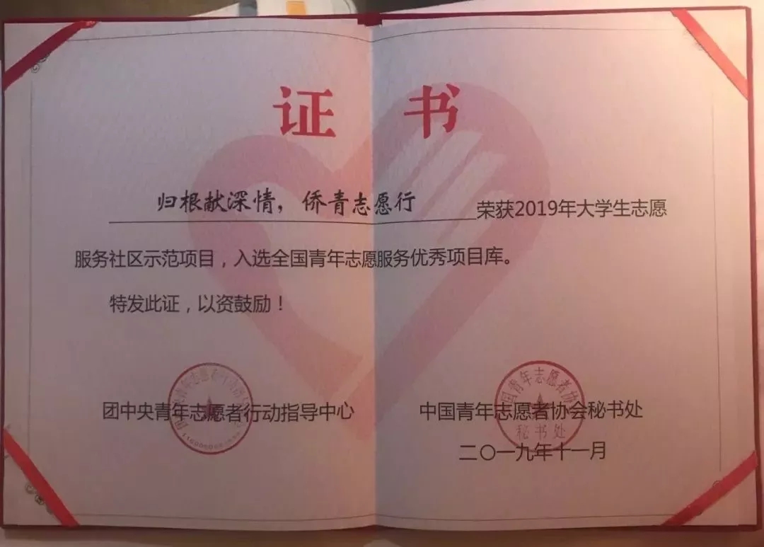 日前,在第五届中国青年志愿服务项目大赛中,华侨大学“归根献深情 侨青志愿行”志愿服务项目获评2019年大学生志愿服务社区示范项目,并入选全国青年志愿服务优秀项目库。
