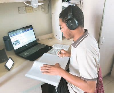 2月27日上午,华侨大学土木工程学院安哥拉留学生比特坐在宿舍书桌前,对着电脑,准备开始新一天的“线上学习”。