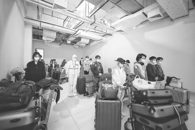 4日,在厦门机场入境人员分流服务中心,一线战“疫”的工作人员以及在休息室等待的入境旅客向新冠肺炎疫情牺牲烈士和逝世同胞默哀。福建日报记者 廖丽萍 施辰静 摄