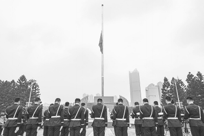 4日,福州市五一广场国旗护卫队队员在国旗下默哀。福建日报记者 林熙 摄