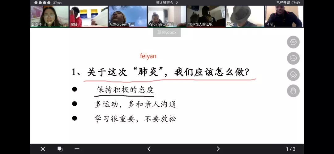 文明如水,润物无声。把“思政课堂”同社会大课堂结合起来,是新时代思政课程的要求。学院充分发挥“课程思政”意识,每周召开网上“云”班会,境内境外学生同进行。至今已经召开了15次班会,班会主要结合战“疫”主题,精选角度,讲述防疫抗疫一线感人故事,介绍政府管理体系和社会组织在疫情防控中的作用,介绍中国在牢牢守护14亿人民生命健康的同时,主动向世界各国提供帮助,以实际行动助力全球抗疫的行为。让他们切身感受中国政府在战“疫”期间做出的种种努力,及时传递防疫正能量。同时,结合留学生特点, 用简明和生动活泼的汉语,科普疫情最新动态,用亲切温暖的互动,关心学生近期的心理状态及学习情况。强信心、暖人心,为疫情防控贡献思政力量。