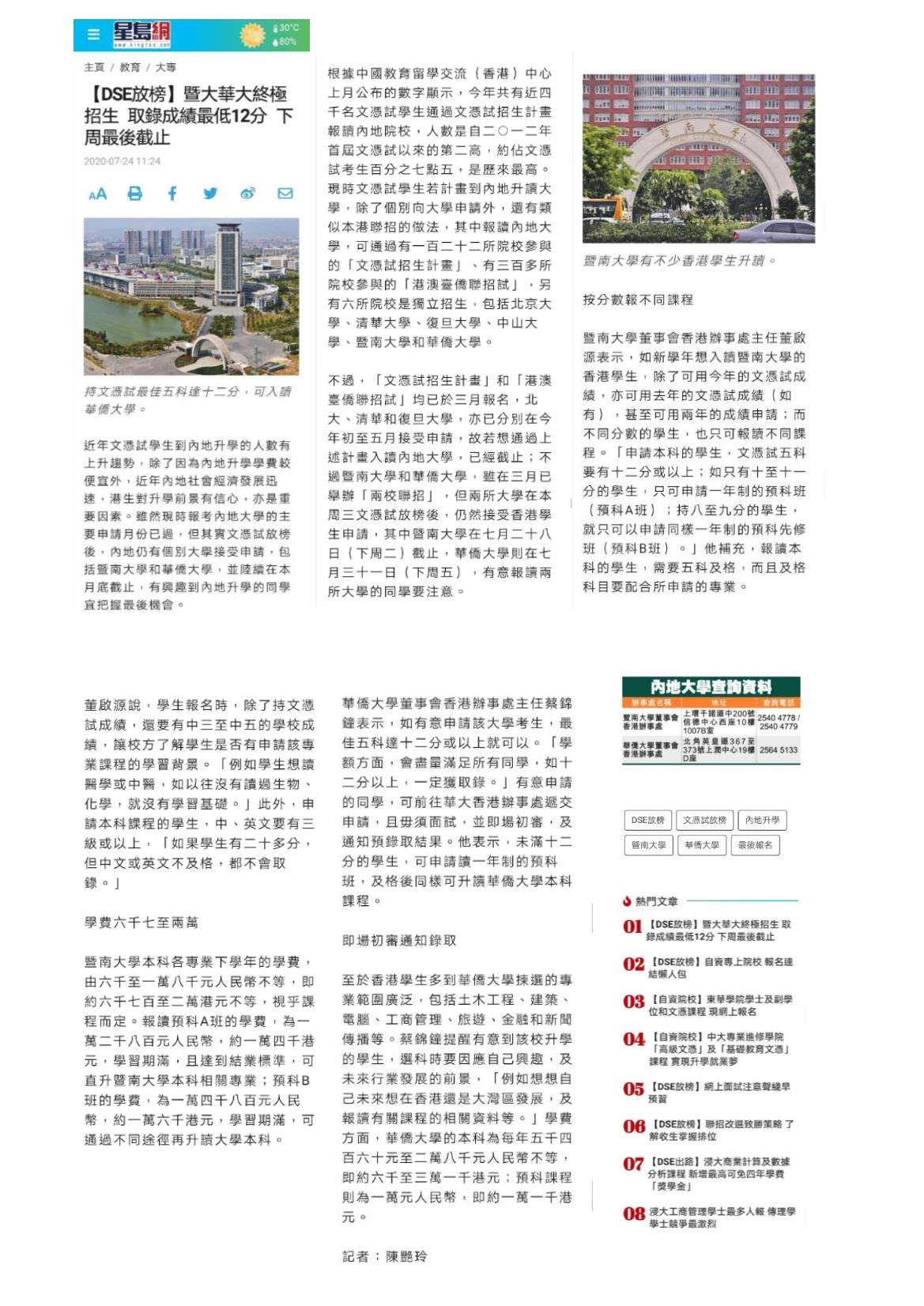 华侨大学董事会香港办事处主任蔡锦钟表示,如有意申请该大学考生,最佳五科达十二分或以上就可以。「学额方面,会尽量满足所有同学,如十二分以上,一定获取录。」有意申请的同学,可前往华大香港办事处递交申请,且毋须面试,并即场初审,及通知预录取结果。他表示,未满十二分的学生,可申请读一年制的预科班,及格后同样可升读华侨大学本科课程。