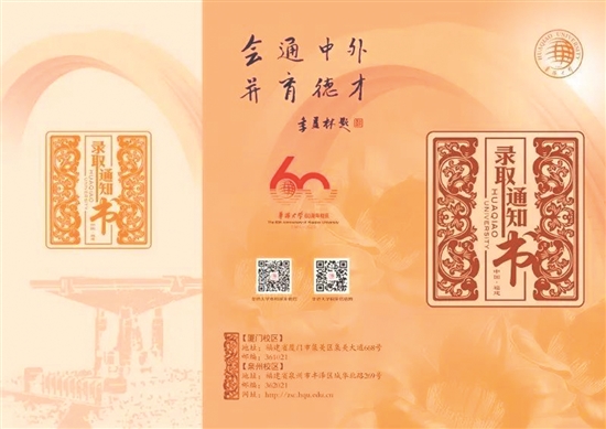 华侨大学自1960年创办至今已经走过60个年头。因此,今年录取通知书的亮点便是封面中心的校庆专属标识。封面正上方为季羡林先生亲手题写的“会通中外、并育德才”,富有特殊的人文色彩;左上方的拱形校门以及左下方的承露泉,彰显侨校特色——聚莘莘学子于五湖四海,育创新英才惠四面八方,更象征着华侨大学包容万有之胸襟,春风化雨之情怀。