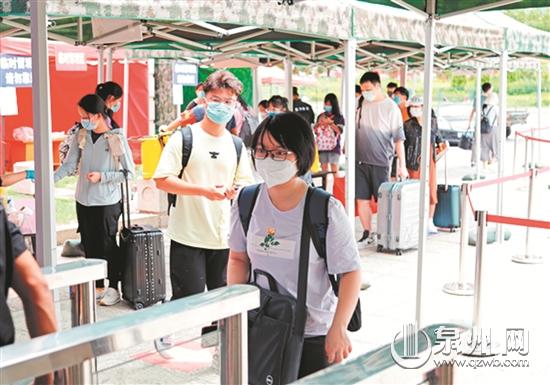 日前,华侨大学的工商管理学院大二学生虞英冉顺利进入校园,是该校最早返校的学生之一。“经历了200多个日夜,看到阔别已久的华大,心中有种说不出的激动和亲切。”他说,虽然是深夜,等待入校的队伍比较长,但同学们都安静有序地等待扫码、测温。“回到校园,在熟悉的石板路上拖起大皮箱时,心中真是百感交集。”值得一提的是,为提高效率,节省通行时间,进校门前,工作人员直接上车为学生测体温,车进校门后,志愿者上车核验学生身份,随后车将学生送到宿舍楼附近,再对行李进行统一消杀,最后学生返回宿舍。