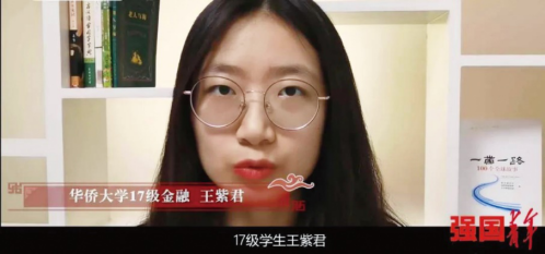6月4日,一档由团中央网络影视中心、中国青年报社、中国文艺志愿者协会、新东方在线联合出品的具有鲜明青年派风貌的大型融媒体文化节目——《强国青年》,刊播了华侨大学00后大学生王紫君向来华留学生弘扬“一带一路”倡议精神的事迹。