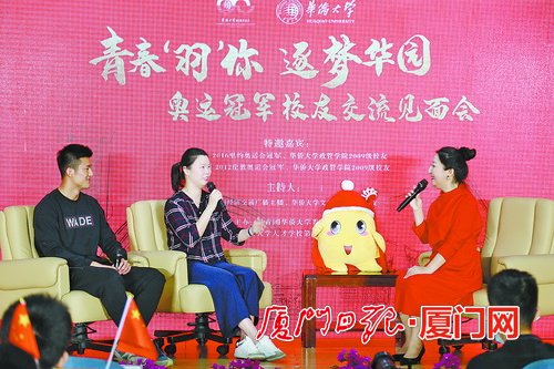 奥运冠军谌龙、李雪芮回到母校华侨大学,与学弟学妹交流。(图/华侨大学 提供)