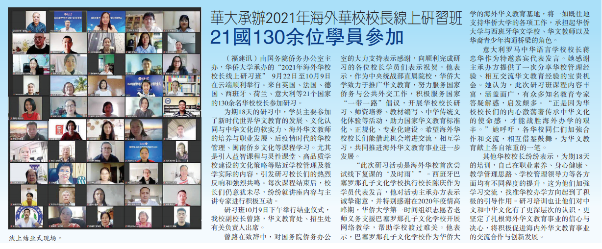 中国侨网10月11日电 10月9日下午,由国务院侨务办公室主办、华侨大学承办的“2021年海外华校校长线上研习班”结业式在云端顺利举行,华侨大学曾路副校长、华文教育处、招生处有关负责人,以及来自21个国家的100余名校长学员参加了结业式,华侨大学华文教育处处长涂伟主持仪式。