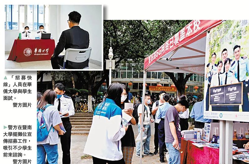 警方今年9月至10月重返香港11间大专院校宣传招募,并接获300多个申请。上月,警方首次派出19人的「招募团」,包括面试及体能考官,于11月7日至11月27日到在港生集中的暨南大学及华侨大学设立「招募快线」,更特意从香港带同特别设备,借用校方课室及运动设施作考试场地,而招募标准跟在香港完全一样。