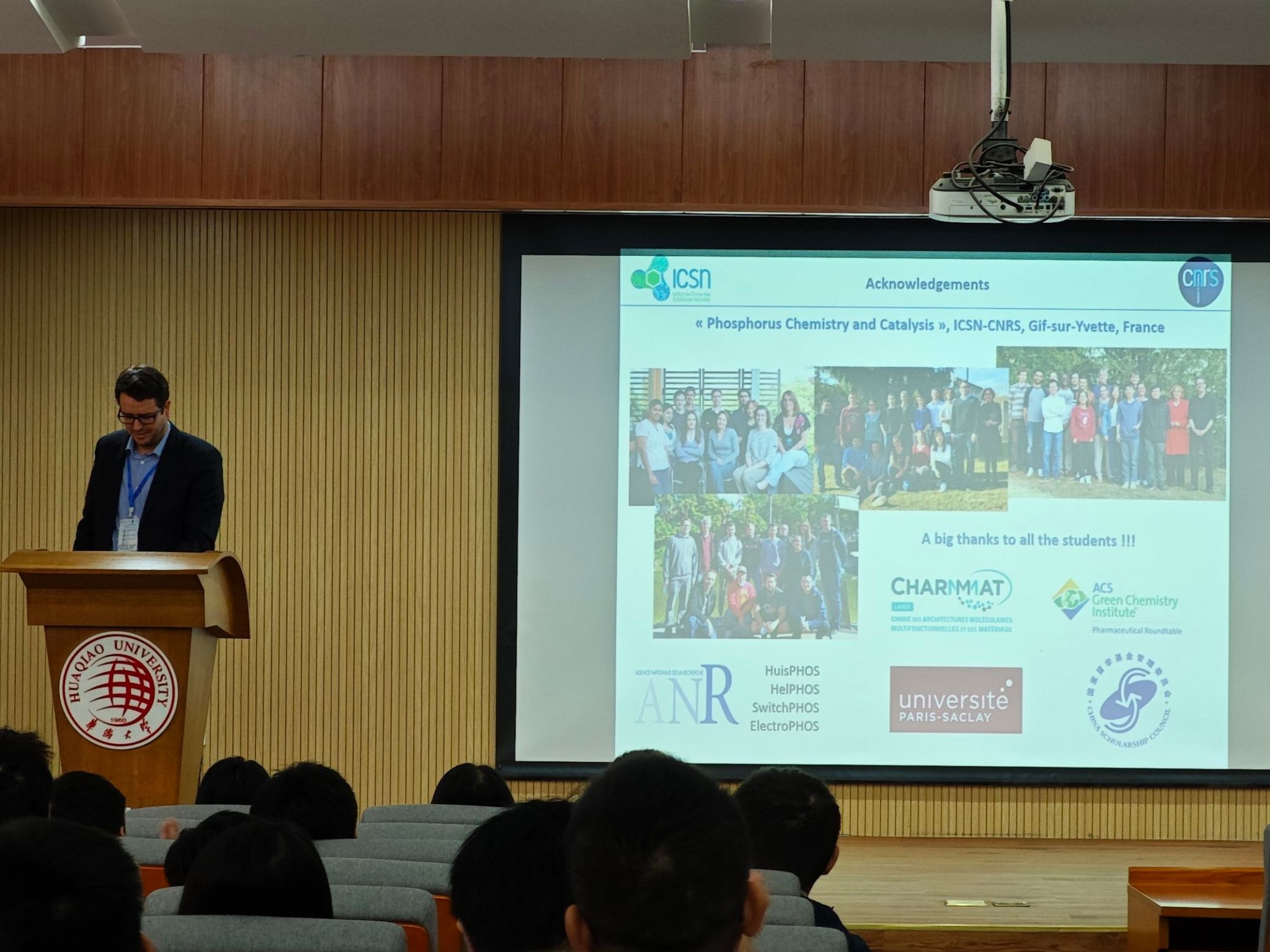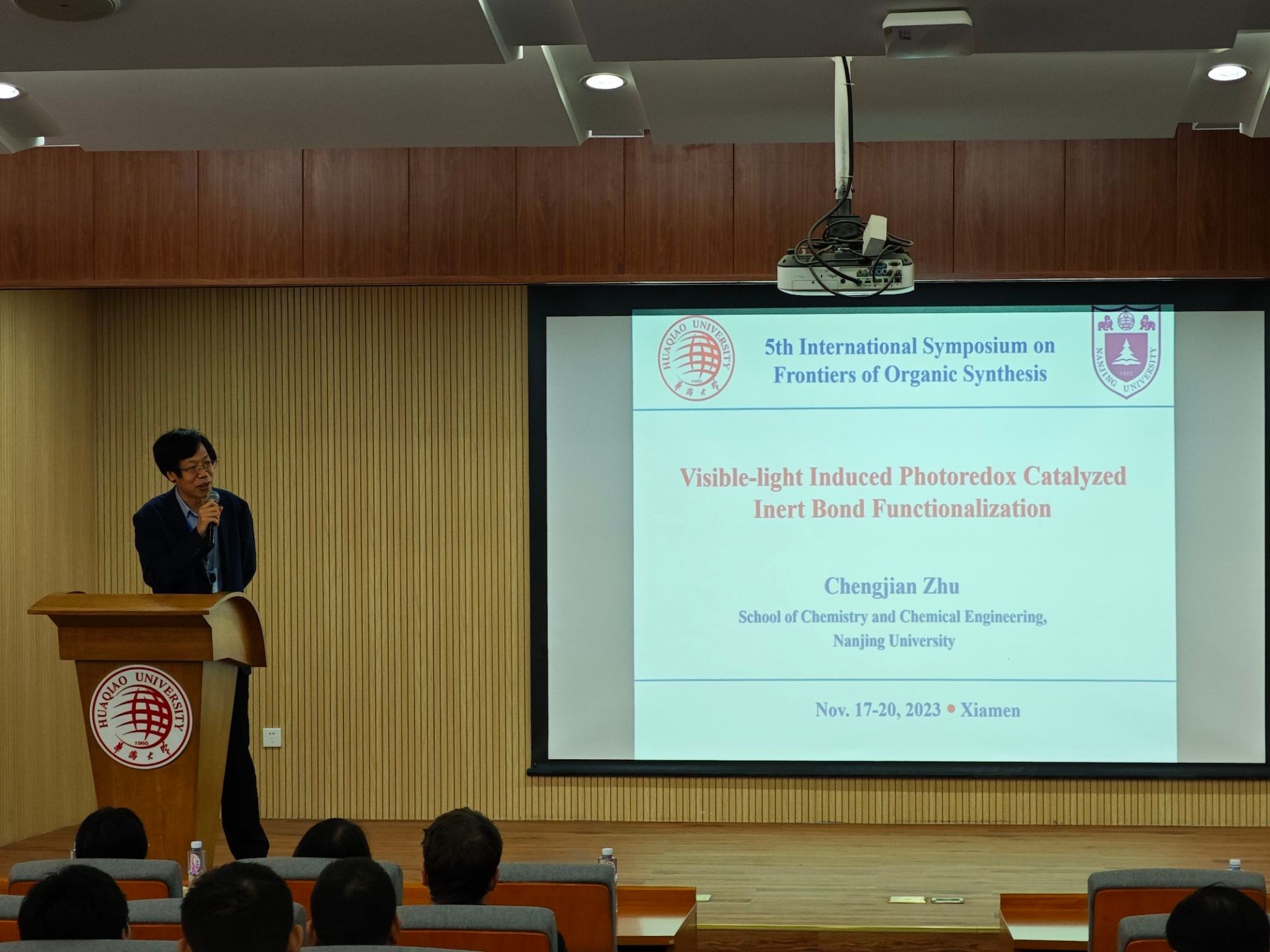 其中,法国国家科学研究院(CNRS)天然产物化学研究所Arnaud Voituriez研究员讲授了“金催化:从新方法的发展到天然产物的全合成”;南京大学朱成建教授以“光氧化还原催化的羧酸转化”为题讲解了一系列光氧化还原和镍催化酰基自由基与惰性有机物通过协同催化发生的偶联反应;东北师范大学张前教授介绍了“基于自由基的C-N键形成新方法”;台湾大学詹益慈教授以“用于构建多孔阵列的分子自组装”为主题介绍他的最新研究成果;厦门医学院王贵弘教授分享了“海洋天然产物在创新化妆品中的应用”;复旦大学张俊良教授介绍了“用于不对称靶催化中的Sadphos手性配体”的前沿技术和科研成果;中国科学院兰州化学物理研究所李跃辉教授作了关于“CO2和NH3的新型氰化反应”的报告;华南理工大学祝诗发教授以“炔烃的多样性”为题分享了研究成果;河南师范大学、洛阳师院校长郭海明教授以“杂环核苷类化合物的设计合成及活性研究”为题进行了学术交流;中国科学院上海有机所的刘元红教授介绍了“多功能化金卡宾中间体的形成”;厦门大学叶龙武教授介绍了“基于酰胺合成不同的氮杂环”;福州大学叶克印教授以“钴催化硼双环[3.3.1]壬烷(9-BBN)硼酸盐迁移的碳-碳交叉偶联”为题同与会人员进行了交流;武汉大学周强辉教授介绍了“基于海洋天然产物引发的苯并稠环合成策略”;法国图卢兹大学Remi Chauvin教授以“具有抗癌和抗结核活性的脂质炔基甲醇衍生物”为题作学术报告;中国科学院上海有机研究所侯雪龙教授以“通过NHC配体控制钯π-烯丙基配合物与亲核试剂反应的选择性”为题作了学术报告。