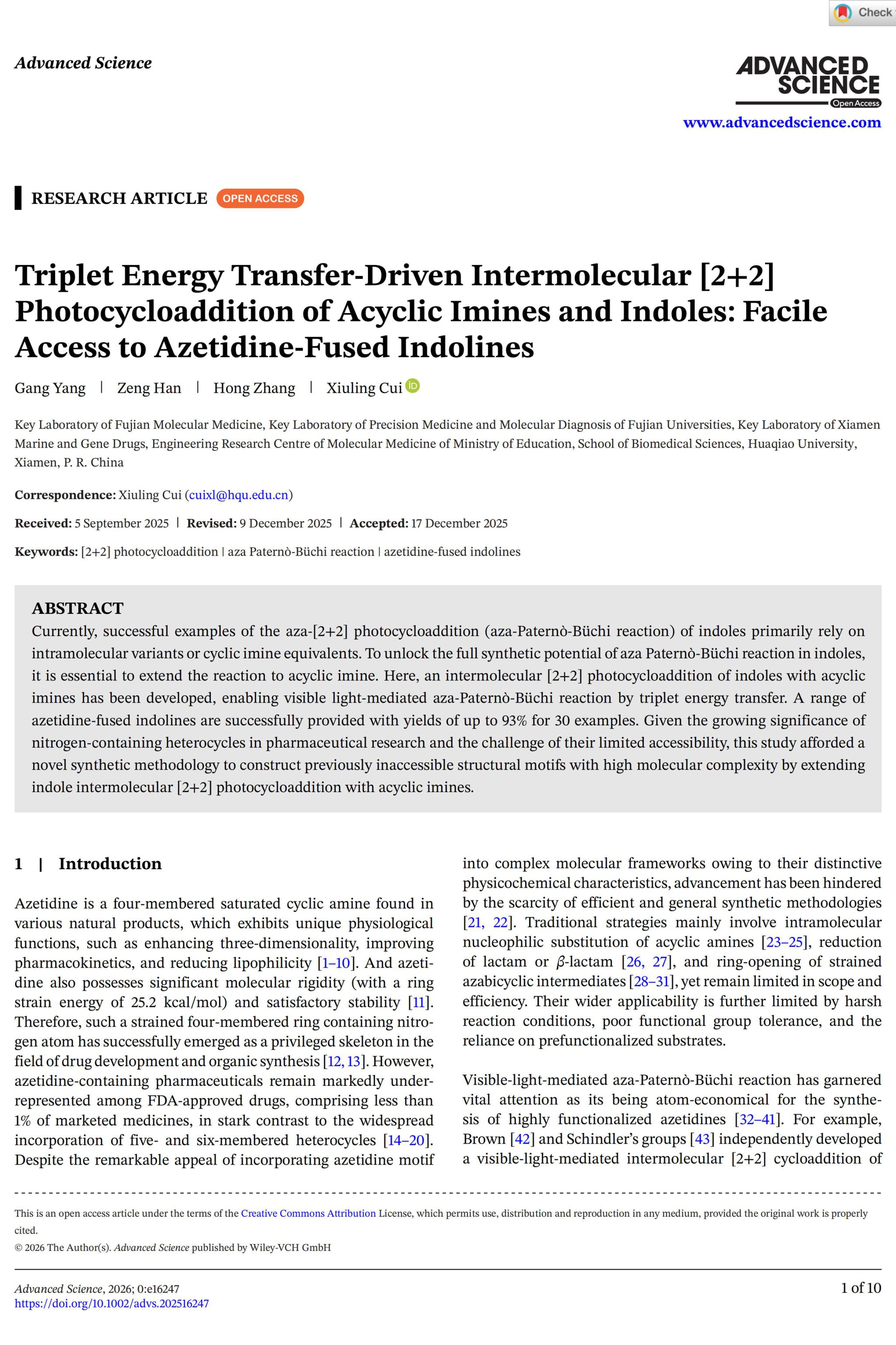 近日,华侨大学医学院崔秀灵教授团队在国际期刊《先进科学》(Advanced Science)上发表题为Triplet Energy Transfer-Driven Intermolecular [2+2] Photocycloaddition of Acyclic Imines and Indoles: Facile Access to Azetidine-Fused Indolines的研究论文,报道了一种以三重态能量转移驱动的可见光[2+2]环加成反应,实现了开链亚胺与吲哚的分子间aza-Paternò-Büchi反应,高效构筑稠合氮杂环丁烷结构单元。
