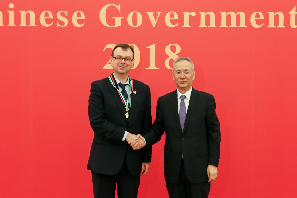 国务院副总理刘鹤为菲利普·卡帕诺夫教授颁奖(图片来源:国家外专局)
