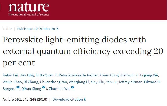 北京时间10月11日,国际顶级学术刊物《Nature》在线发表了华侨大学材料科学与工程学院魏展画教授为第一通讯作者、博士生林克斌为第一作者,华侨大学为第一完成单位的研究论文《Perovskite Light-Emitting Diodes with External Quantum Efficiency Exceeding 20 percent》。这标志着华侨大学在基础研究方面取得了重要的进展,在《Nature》上发表研究论文实现了零的突破。