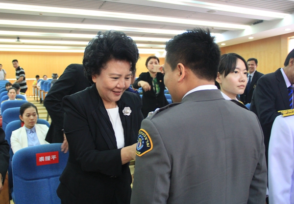 裘援平为外国政府官员中文学习班学员佩戴华侨大学校徽