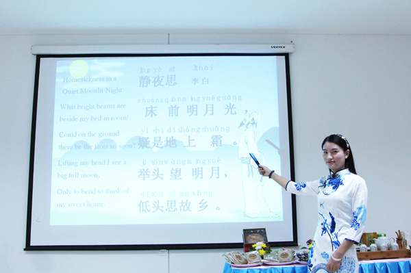 有奖问答环节,学生们个个兴趣盎然,跃跃欲试,各种中秋文化知识问题丝毫难不倒他们,可见大家对中国文化理解的深入。品茶、吃月饼,是学生们期待已久的项目,志愿者老师们让异国的学生也感受到了中秋节氛围。