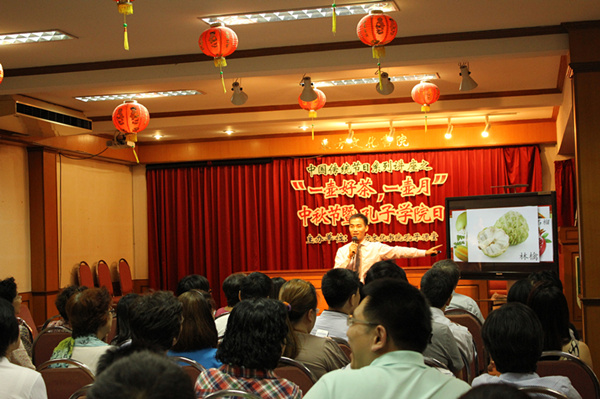 当日下午,汉语教师志愿者柯培勇在《但愿人长久》优美的旋律中开始中秋节的讲座。他结合幻灯片向在场师生介绍中秋节的起源。在中国的农历里,一年分为春、夏、秋、冬四季,每季又分为孟、仲、季三个部分,因而中秋称作“仲秋”。“仲秋”的月亮比其他月份的满月更圆更明亮,故又称“月夕”、“八月节”。人们借此寄托自己对故乡和亲人的思念之情。随后,柯培勇以广东潮汕地区为重点向大家讲述各地风俗,“拜月娘”“剥芋头”“烧蚁窟”等中秋节传统活动展现眼前,当然也包括中秋节必备习俗之吃月饼。俗话说“八月十五正月圆,中秋月饼甜又香”,月饼除了是中国人月下团圆时的桌上佳肴,也是中秋时节亲朋好友间联络感情的重要礼物。近年来,月饼热售于泰国各大商场,口味多样,深受各国人们喜爱。