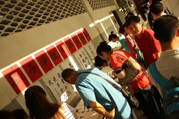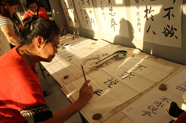金秋送喜,中秋佳节恰逢孔子学院日,东方文化书院孔子课堂组织了孔子学院日书法体验的活动,由于大部分的书院师生没有接触过中国书法的毛笔与宣纸,甚至不懂握笔的姿势,孔子课堂安排时间对他们进行基础书法要领培训后,学生们利用课余时间进行书法体验。在书法体验过程中,汉语教师志愿者在和学生分享孔子的千古警句,讲解孔子流传至今的做人教学理念的同时,规范学生们的书写姿势,向他们介绍下笔时的轻重缓急,以感受真正的书写魅力。学生们对书法体验活动表现出很大兴趣,驻足书法体验区进行体验,表示很满意自己的“书法作品”。