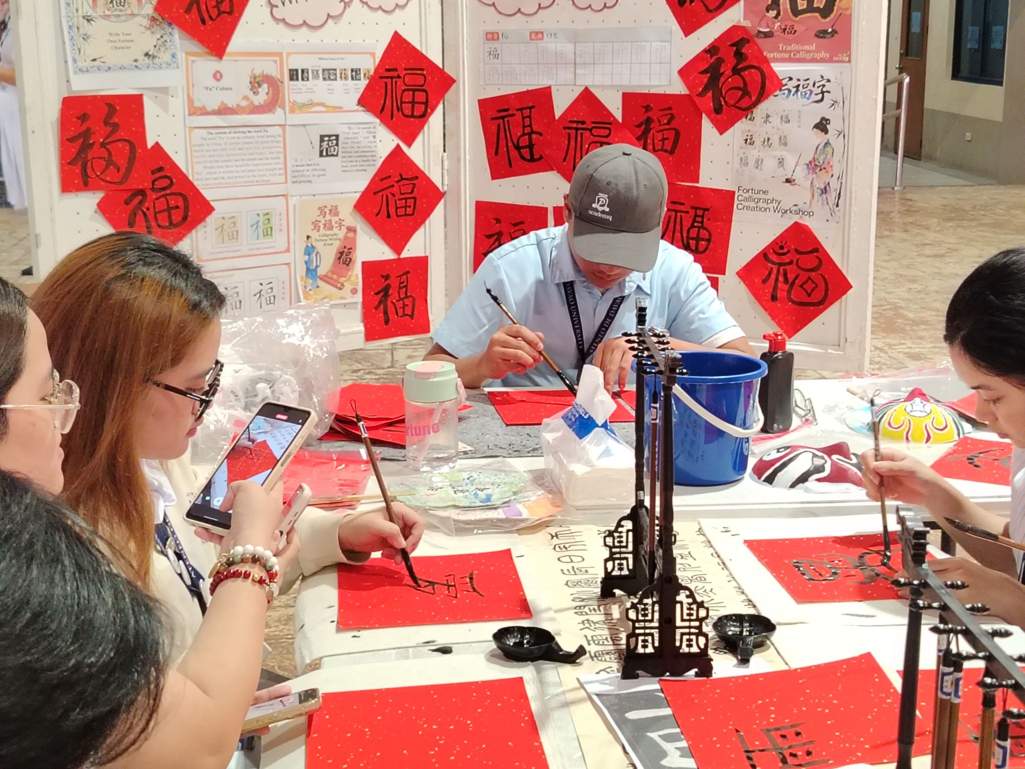 活动现场,孔院教师精心设置了非遗漆扇、“福”字书法、京剧脸谱、中国结编织、投壶游戏、汉服换装等多项文化体验项目,师生们在沉浸式互动中领略中国传统文化的魅力。