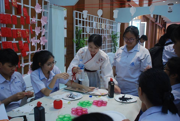 2019年也是普吉中学孔子课堂成立十周年。值此新春文化节,普吉课堂还联合普吉女子中学、普吉皇太后中学共同举办了“普吉基教委中学汉语教学十年(2009-2019)成果展”。在欣赏完美轮美奂的文艺演出之后,各位嘉宾移步至汉语教学成果展展区,为本次展览剪彩并一同参观。