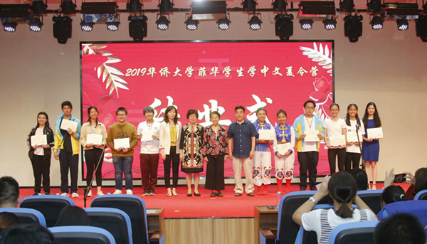 2019年华侨大学菲律宾华裔学生学中文夏令营结业式近日在华侨大学华文学院多功能厅举行。华文学院院长胡培安、党委书记纪秀生,菲律宾华教中心副主席杨美美等出席结业式并为学员颁发结业证书、获奖证书。
