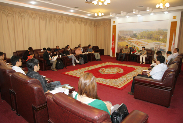 校党委副书记朱琦环在陈嘉庚纪念堂二楼接待室会见来访客人,对记者团的来访表示欢迎,并向他们介绍了华侨大学的办学历史、人才培养、师资队伍、教学科研等基本情况。