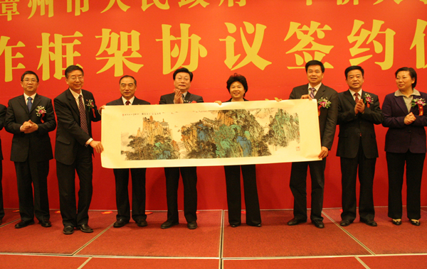 双方互赠纪念品。图为我校向漳州市人民政府赠送山水画。 |