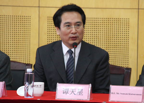 12月29日上午,泰国国会主席兼下议院议长颂萨•革素拉暖博士一行访问华侨大学,并看望正在华侨大学进修汉语的泰国政府官员中文学习班全体学员。中国国务院侨办副主任、中国海外交流协会副会长谭天星陪同访问,并出席颂萨主席与泰国政府官员中文学习班学员们的座谈会。