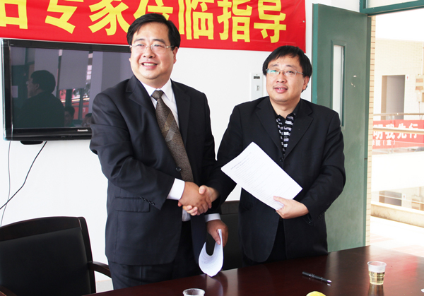化工学院院长王士斌(右)与泉州斯达纳米总经理李贝(左)签署战略合作协议