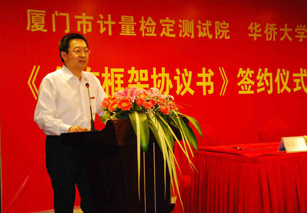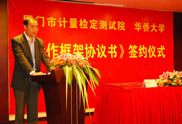 校院合作签约仪式11日下午在厦门市怡翔华都酒店隆重举行,厦门市计量检定测试院副院长史园与华侨大学科研处副处长高轩能分别代表院校双方在协议书上签字。厦门市质量技术监督局副局长张金龙、华侨大学副校长徐西鹏出席签约仪式并作讲话。