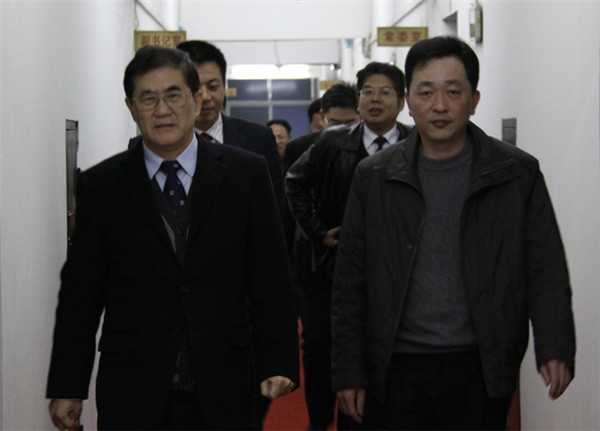 洛江区区委书记吕竞(右一)向丘进校长一行介绍洛江概况