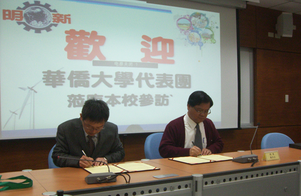 华侨大学与台湾明新科技大学14日上午签署交流合作意向协议书。根据协议,两校将在学术及资料交流、教师和研究人员研修、学生互派等方面开展合作交流。华侨大学教务处处长池进、明新科技大学教务长吕博裕分别代表两校在协议书上签字。