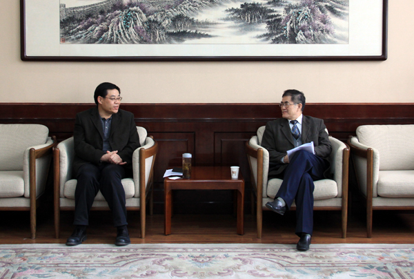 丘进校长与中国社科院法学所李林所长(左)就继续实施所、校战略合作进行商谈。