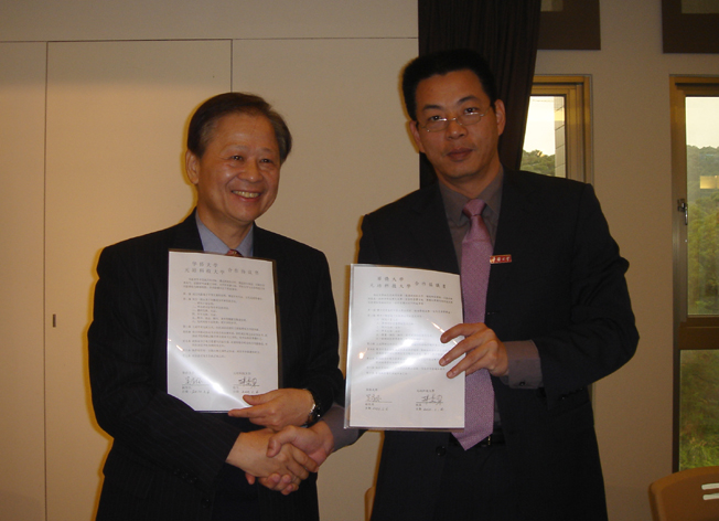 华侨大学副校长吴季怀与元培科技大学校长林进财(左)代表两校签订合作协议书,签约成功,握手致意