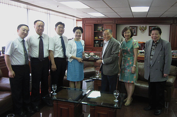 5月22日、23日,在印尼访问的校党委副书记朱琦环率我校调研团一行拜访了泛华集团总部和国际日报社,并拜会了华大董事会副董事长郑年锦。
