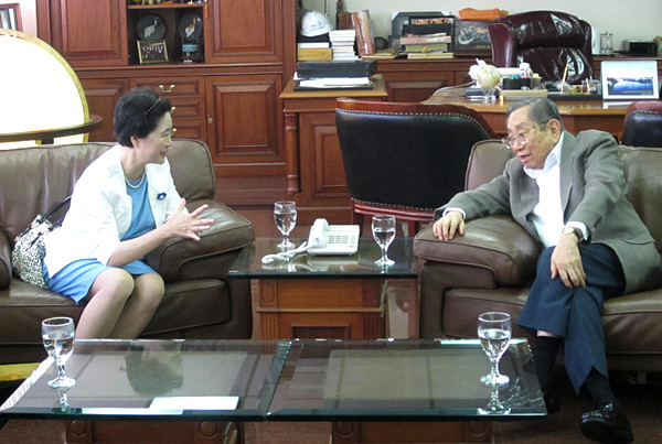 23日上午,朱琦环一行专程拜会了华大董事会副董事长郑年锦。朱琦环代表学校全体师生向郑年锦先生为华大教育事业发展所作的贡献表示感谢,并转达了贾益民校长的亲切问候。她并介绍了近几年我校的建设发展情况,重点就通过推广海外华文教育和设立泛华学院为印尼华侨华人服务的相关工作作了介绍。