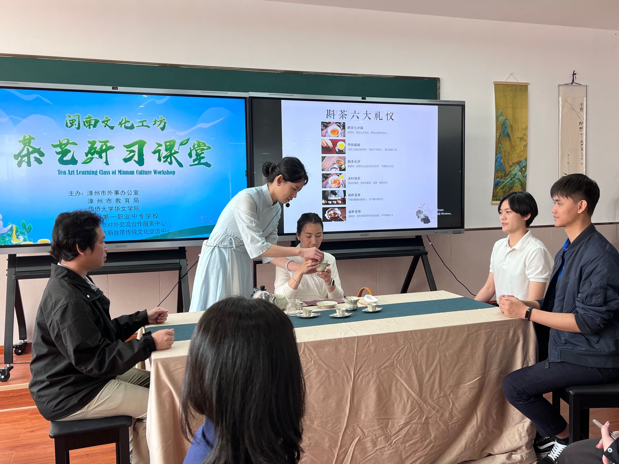 功夫茶作为闽南文化的重要组成部分,不仅深受本地人喜爱,更“圈粉”国际友人。近日,由我校华文学院、漳州市外事办公室、漳州市教育局联合主办的“闽南文化工坊茶艺研习课堂”在漳州第一职业中专学校开课。我校10个国家的外国政府官员中文学习班学员及部分留学生代表,通过为期五天的理论培训、产业考察及现场研学,沉浸式体验闽南功夫茶技艺和底蕴魅力,开启一场跨越国界的闽南文化对话。