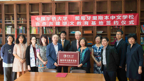 在里斯本中文学校,双方签署合作协议共建华侨大学海外华文教育基地。中国驻葡萄牙大使馆领事部主任诸葛蔡延,里斯本中文学校名誉校长、中华总商会会长蔡文显,里斯本colegio o pelicano学校Marina校长,里斯本中文学校校长陈晓红,里斯本中文学校家长委员会主任雷其沐,葡萄牙东方概念中国文化协会会长杨晶杰等嘉宾见证签字仪式。