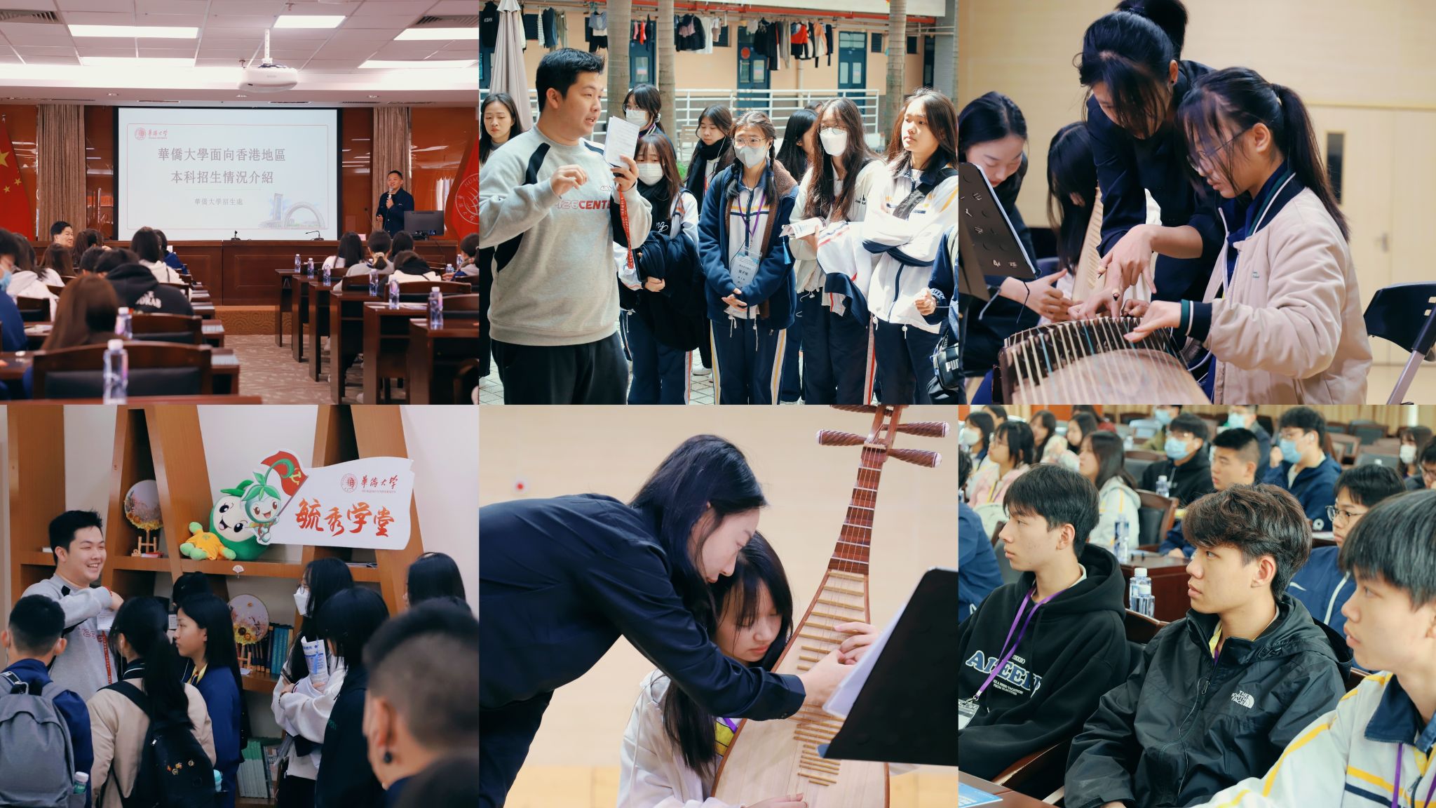 当天,香港中学师生观摩我校音乐舞蹈学院的民乐课程,学习了解多种民乐演奏乐器并进行体验,听取《“一带一路”的历史与发展》专题讲座,与招生处老师面对面,咨询相关招生政策、奖助学金、专业设置、就业方向等问题,并同我校香港学生互动交流。他们还参观毓秀侨苑,走进餐厅,漫步校园等,了解我校的住宿、用餐等校园生活环境。
