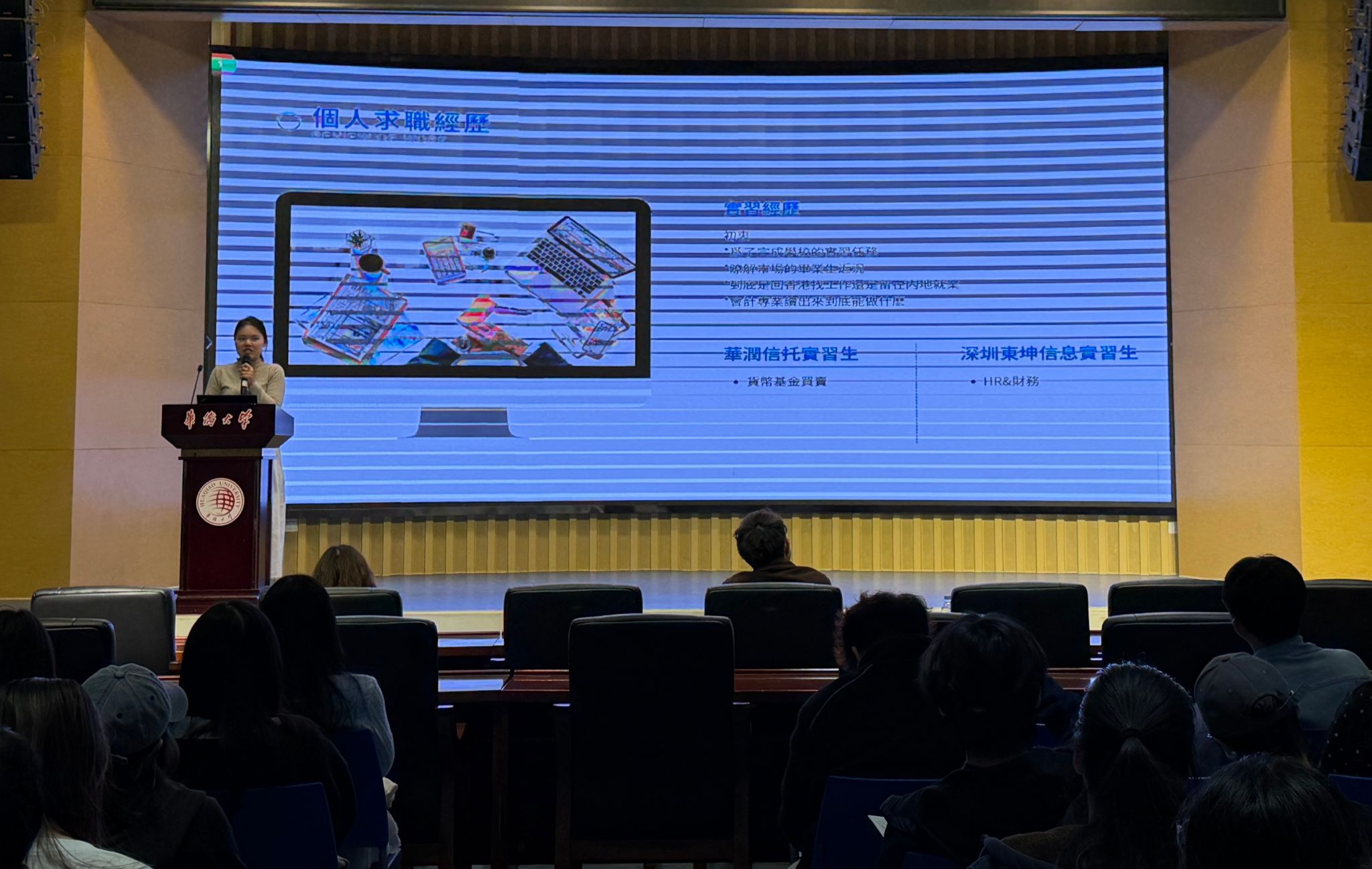 分享环节中,嘉宾们以鲜活案例切入,既有职场奋斗的实战经验,也有职业选择的理性思考,内容兼具实用性与指导性。问答互动环节,港生们踊跃提问,围绕行业发展前景、求职技能提升、大湾区就业政策等问题与嘉宾深入交流,现场氛围热烈。来自经济与金融学院的香港学生陈林表示:“通过学长学姐的悉心讲解,我对未来的职业规划有了更明确的方向,对香港的发展也更有信心,希望能为大湾区发展和国家发展贡献力量。”