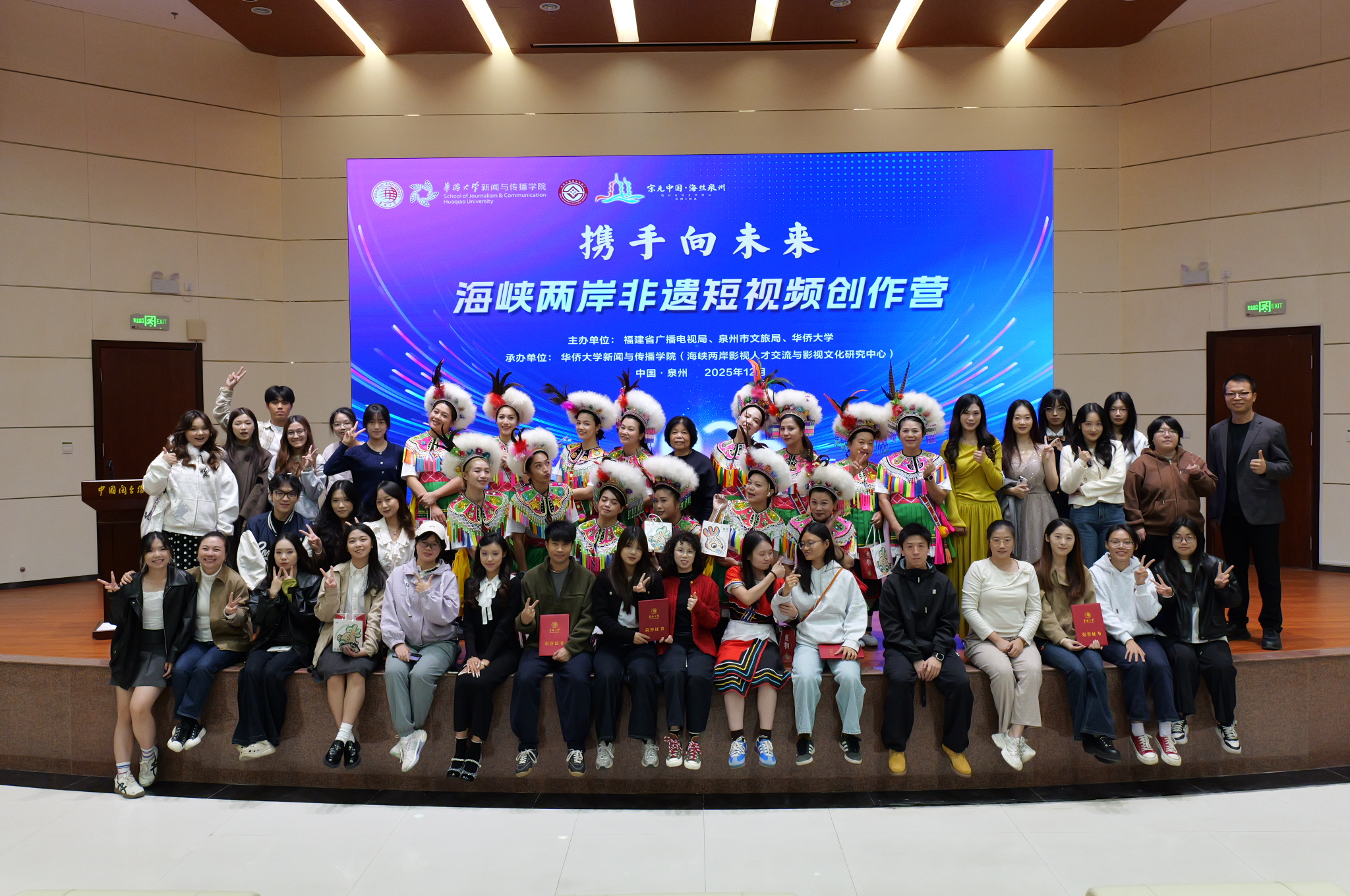 由福建省广播电视局、泉州市文化和旅游局与华侨大学联合主办,华侨大学新闻与传播学院、海峡两岸影视人才交流与影视文化研究中心承办的“携手向未来:海峡两岸非遗短视频创作营(2025)”,12月15日在泉州闽台缘博物馆举行颁奖及闭幕仪式,为期5天的共创活动圆满落幕。