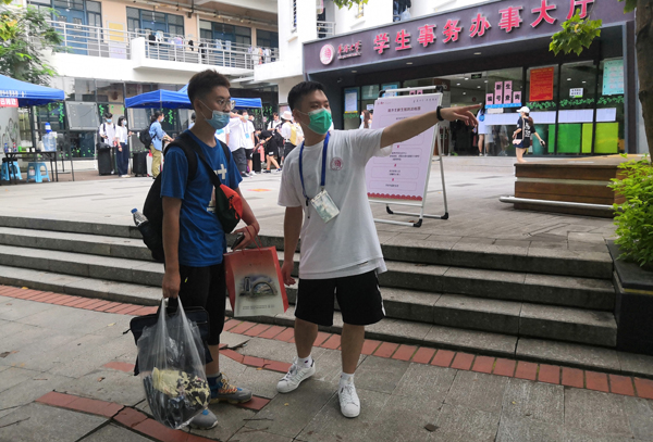 港澳台侨学生志愿者引导新生排队办理报到手续