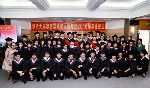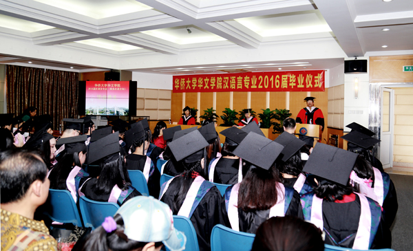 6月23日下午,华文学院汉语言专业商务汉语方向2016届(夏季)毕业生毕业典礼在华文学院学术报告厅举行。来自泰国、印尼、缅甸、柬埔寨、菲律宾、日本、乌兹别克斯坦、乌干达、伯利兹等九个国家的40余名毕业生和他们的家长、朋友一起参加了毕业典礼。