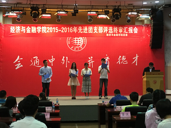 5月6日晚,经济与金融学院2015-2016学年先进团支部评选终审汇报会在洪祖杭楼四楼明德堂举行,共有2013、2014两个年级10个团支部晋级终审汇报会。