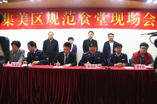 会上,我校后勤餐饮服务中心常务副主任房一伟围绕我校食堂经营管理模式、运行机制以及“一二三四五六”的特色食品卫生安全防范体系建设情况向与会人员作示范经验介绍。随后,市、区市场监督管理局领导对当前集体食堂食品安全的严峻形势进行了总结分析,高度评价了我校食堂规范化管理工作取得的成效,并对下一阶段如何加强食堂经营管理,全面推广华大经验,以保障食堂食品安全提出了明确要求。此外,区市场监督管理局还与相关学校、企业食堂负责人代表签订了餐饮服务食品安全承诺书。