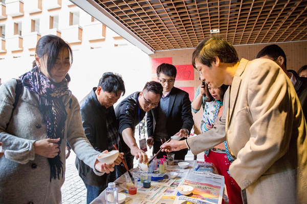 与会嘉宾用刻刀、颜料和陶瓷杯进行现场创作